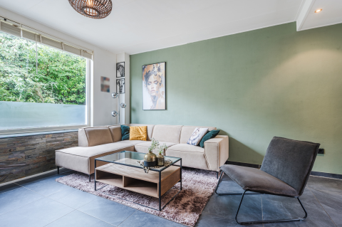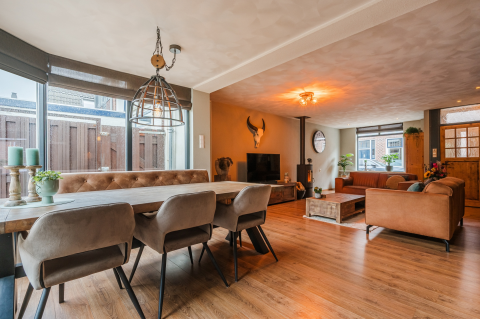 - Lichte en sfeervolle woonkamer, inclusief uitbouw met schuifpui en een stijlvolle PVC-vloer